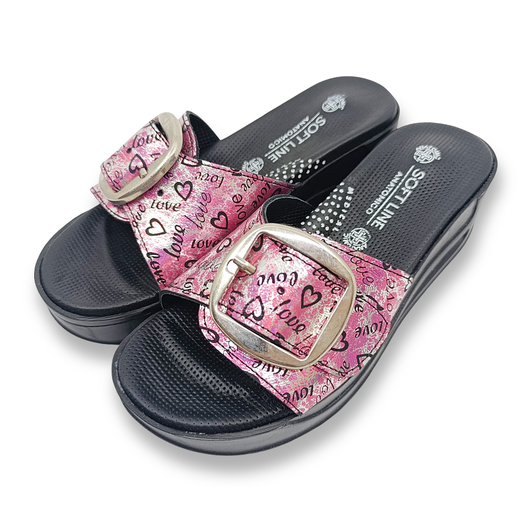Uživajte u svakom koraku s ovim udobnim anatomskim ženskim natikačama koje spajaju moderan dizajn i vrhunsku udobnost. Gornji dio natikača krase atraktivne nijanse ružičaste s natpisima i srcima, a ukrasna metalna kopča dodatno ističe njihov jedinstveni izgled. Idealne su za svakodnevno nošenje, bilo kod kuće, u uredu ili za laganu šetnju gradom.